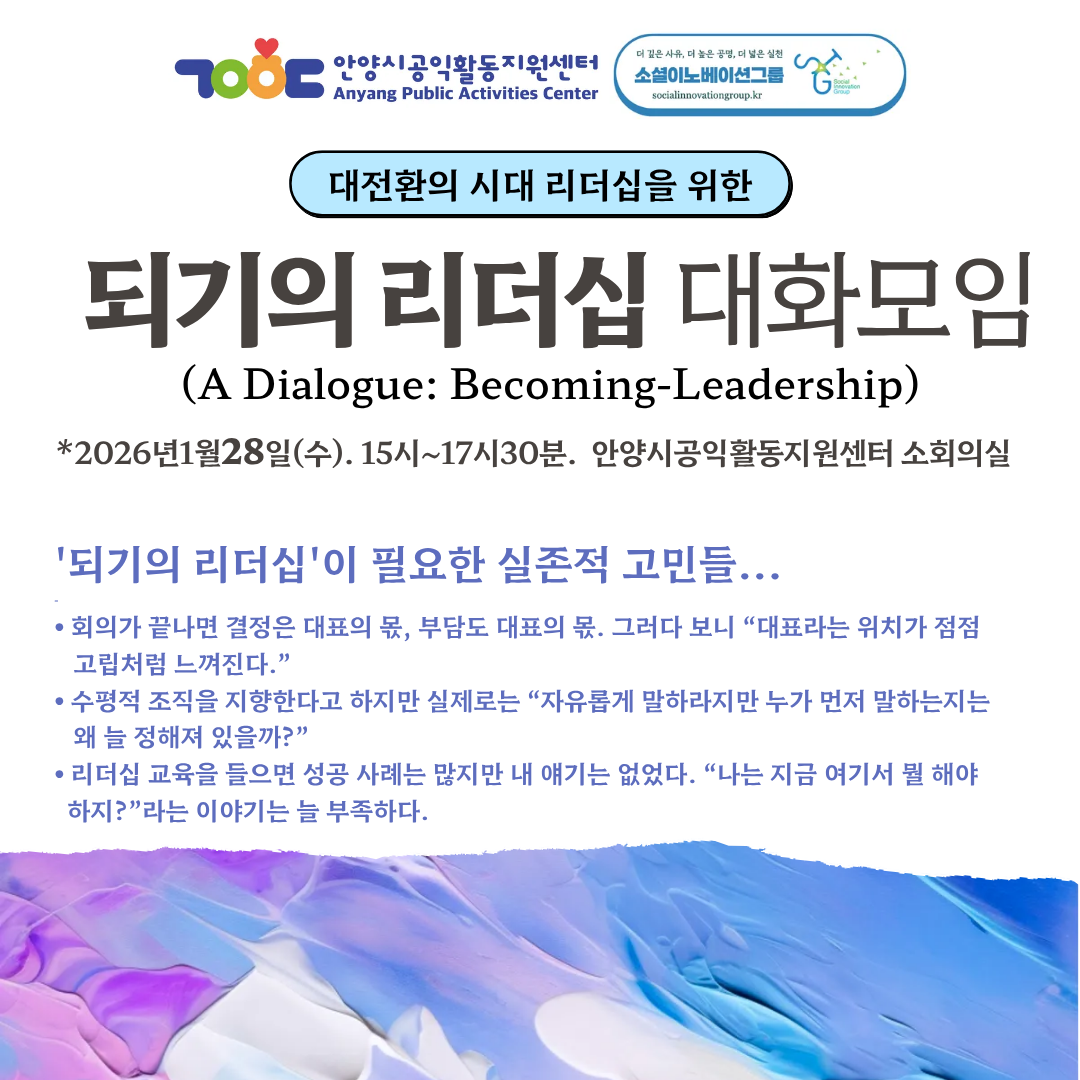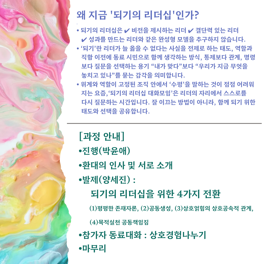 ⦁ 위계와 역할이 고정된 조직 안에서 ‘수평’을 말하는 것이 점점 어려워지는 요즘,‘되기의 리더십 대화모임’은 리더의 자리에서 스스로를 다시 질문하는 시간입니다. 잘 이끄는 방법이 아니라, 함께 되기 위한 태도와 선택을 공유합니다.